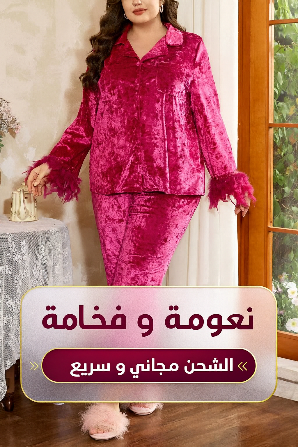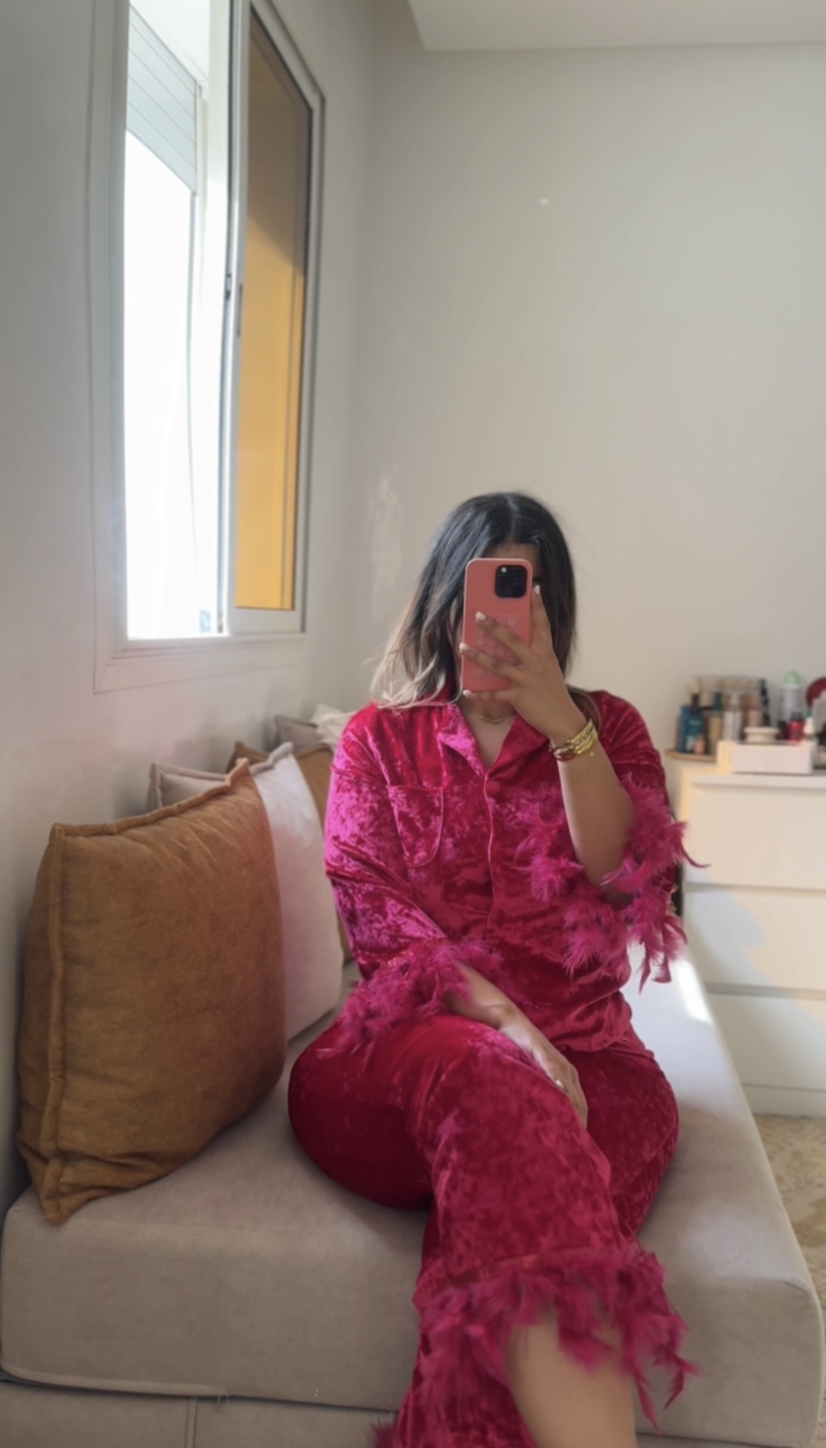 دلّلي نفسك ببيجامة مخملية فاخرة بلون فوشيا جذاب، ناعمة على الجلد بتفاصيل ريش فاخرة تمنحك إحساس الأناقة داخل المنزل.